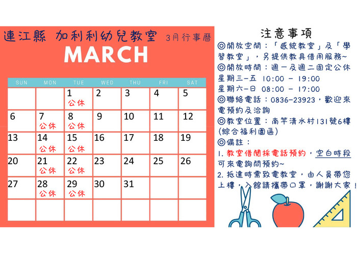 備註:疫情期間,為維持室內社交距離、守護彼此健康安全,同空間時段開放借用人數分別是「感統教室」2組親子、「學習教室」1組親子為限,歡迎大家來電預約及洽詢0836-23923,教室位置於連江縣南竿鄉清水村131號6樓(大同之家6樓),謝謝!