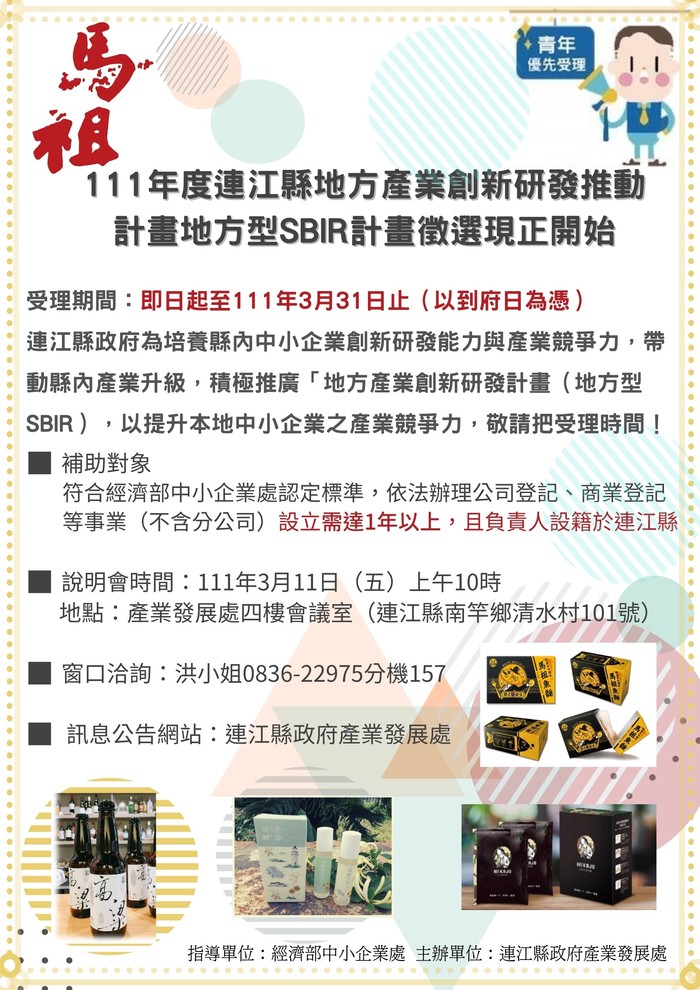 111年地方型SBIR計畫徵件開始 --閱讀人次 : 732 一、為有效輔導及提升地區中小企業產業升級,開始受理111年度連江縣「地方產業創新研發推動計畫(地方型SBIR)」計畫,將於111年3月11日(五)上午10時假產業發展處舉辦說明會,本次收件時間自即日起至111年3月31日止,歡迎踴躍投件!。