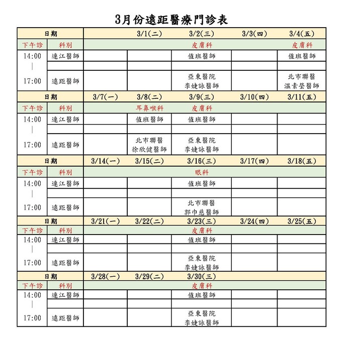 非固定門診:北市聯醫皮膚科、眼科、耳鼻喉科