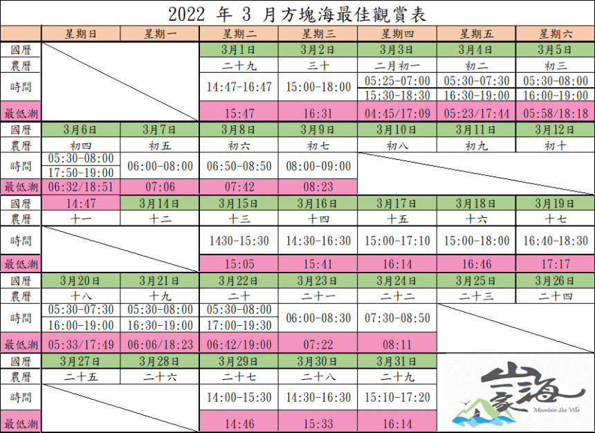 西莒方塊海3月最佳觀賞時間參考表