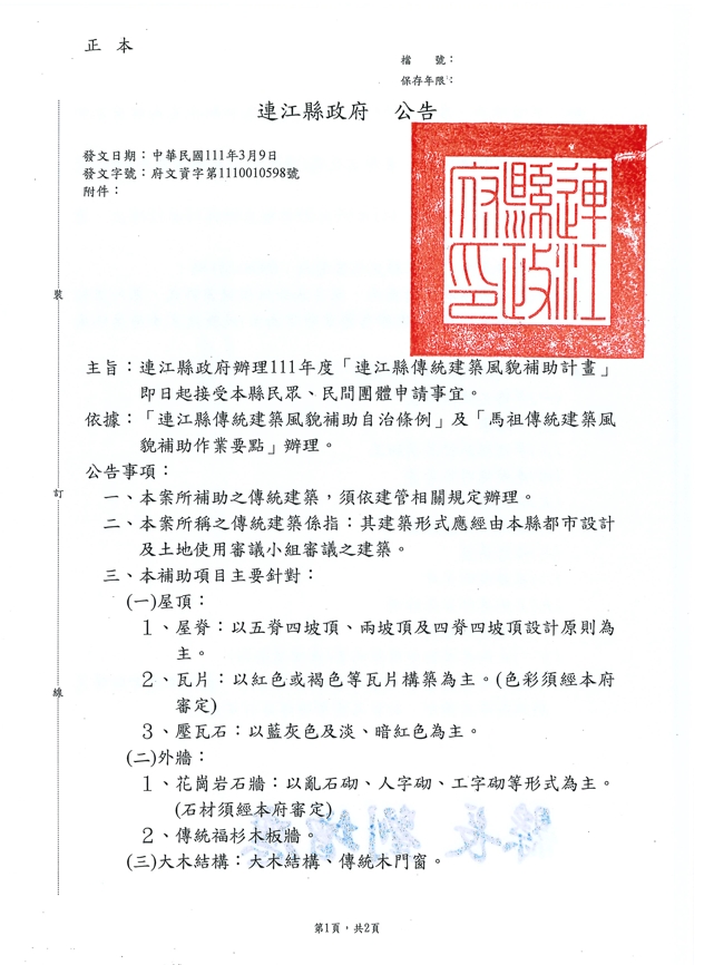 111年度傳統建築補助,開始受理囉~ --閱讀人次 : 2022 111年度- 連江縣傳統建築風貌補助計畫,開始受理申請案件囉~~