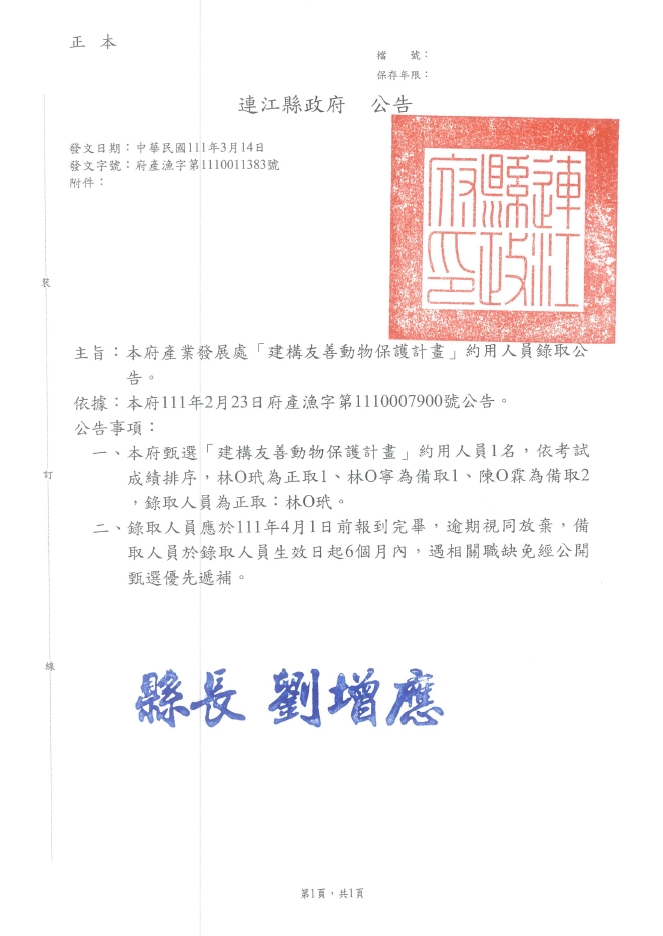 產發處「建構友善動物保護計畫」約用人員錄取公告