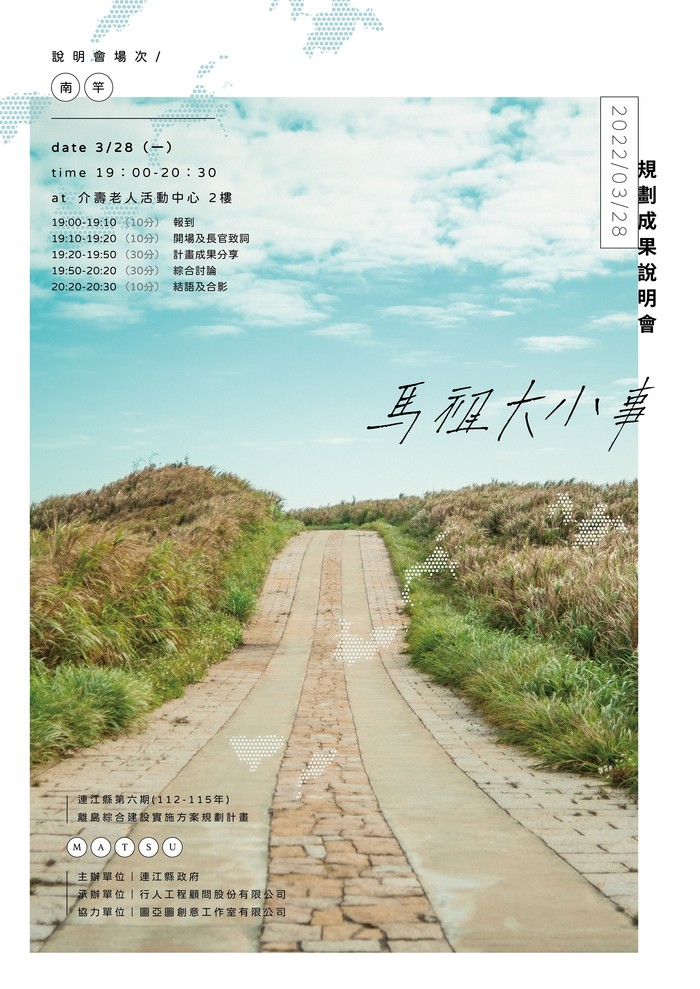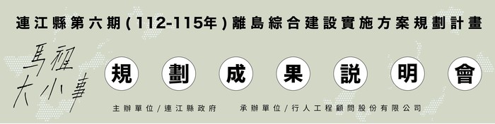 連江縣政府訂於111年03月28日(一) 辦理連江縣第六期(112-115年)離島綜合建設實施方案(草案)成果說明會。內容將聚焦未來馬祖整體發展策略及六期綜建實施方案規劃計畫草案內容進行說明。