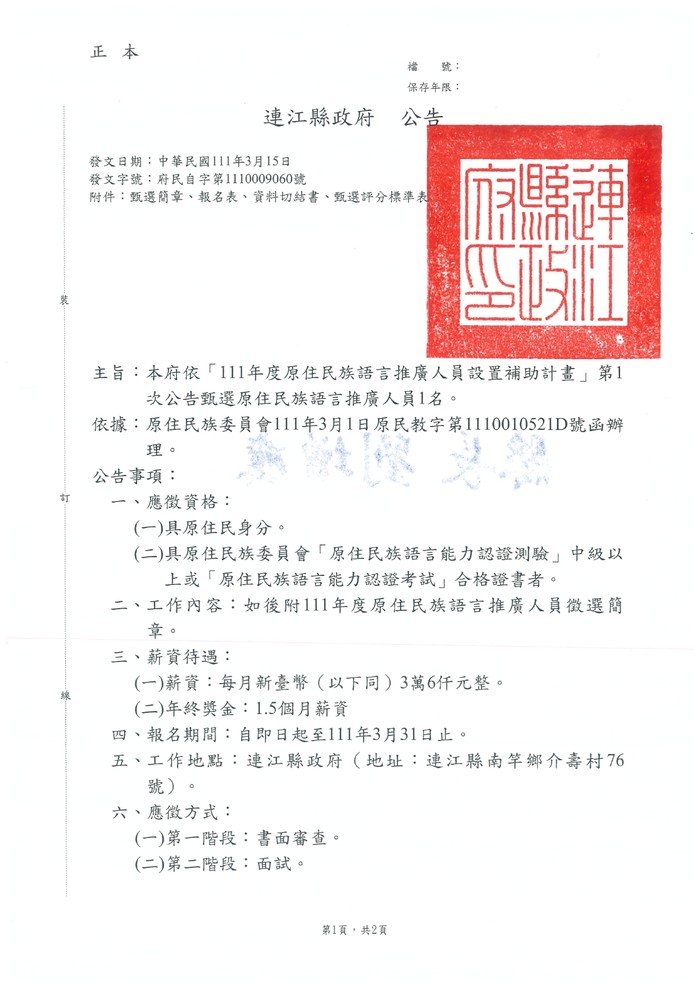 民政處甄選原住民族族語推動人員1名