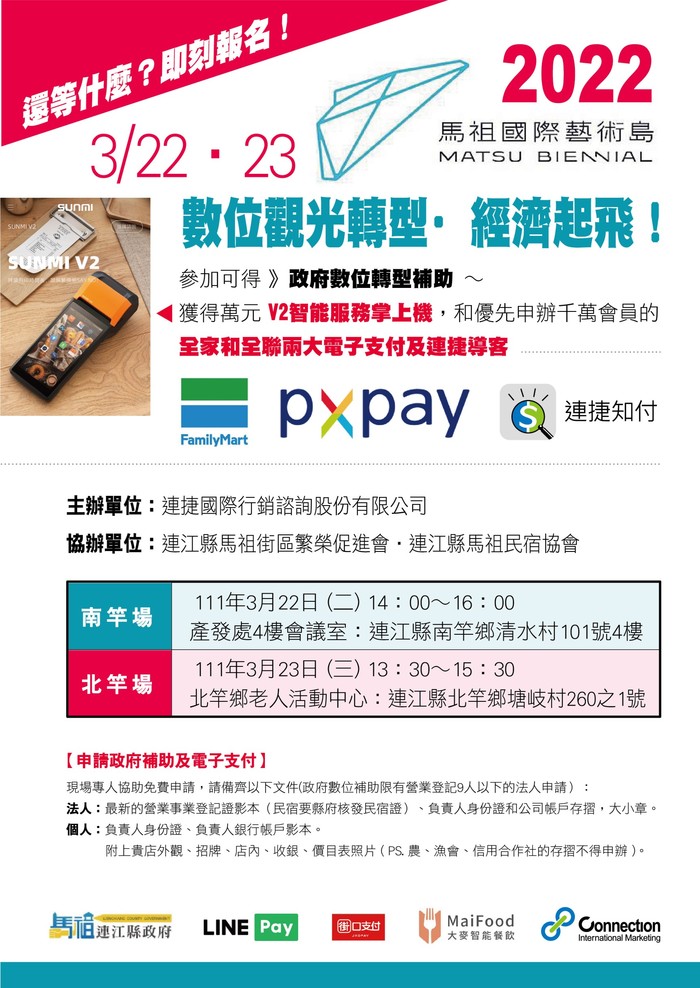 - 歡迎四鄉五島的馬祖交通、民宿、餐廳及店家踴躍報名參加,使全電支普及落地全馬祖,成為全台電支密度最高的地區。