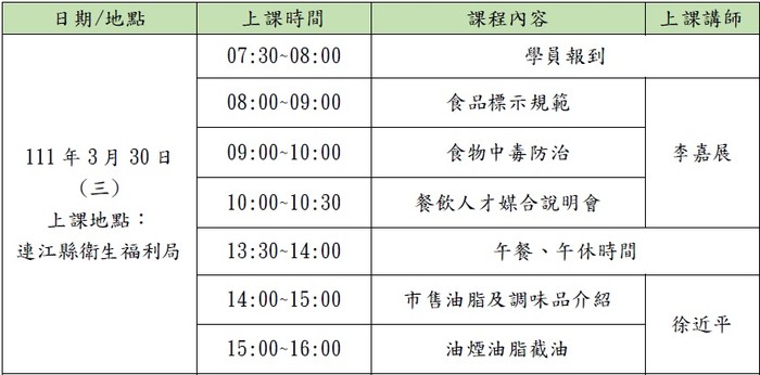 (2)課程時間:3/30 7:30報到,8:00-10:30共2堂課+餐飲人才人力媒合說明會,共計2.5小時