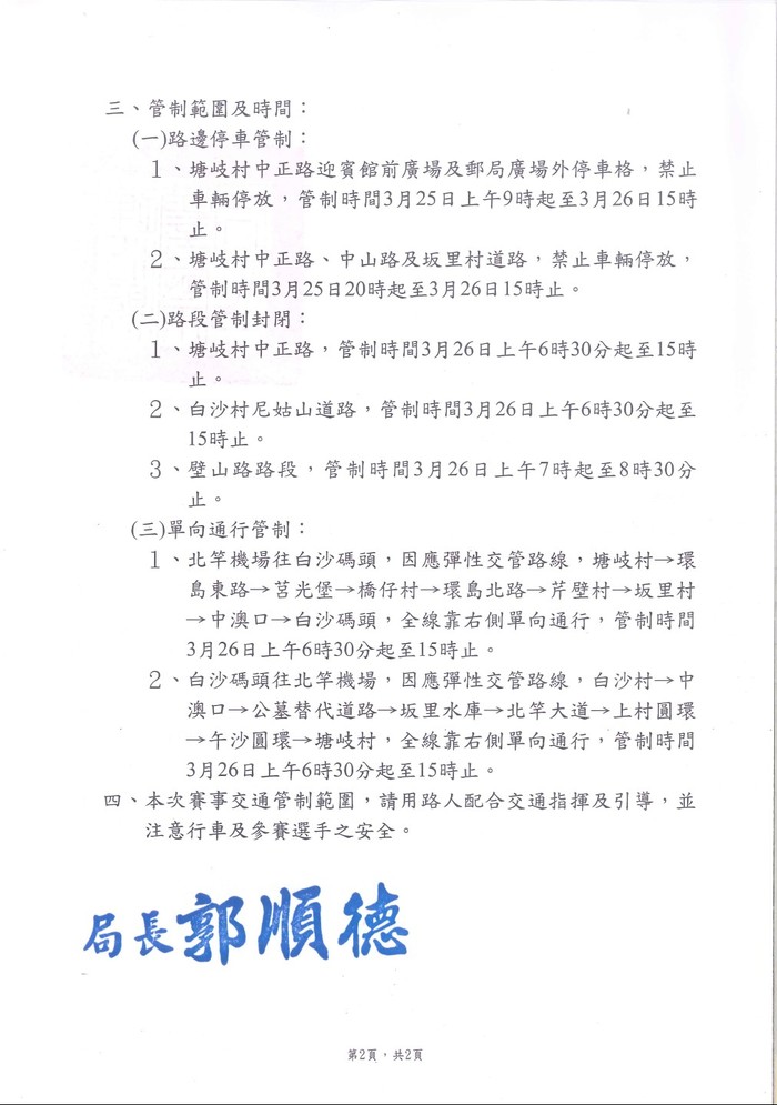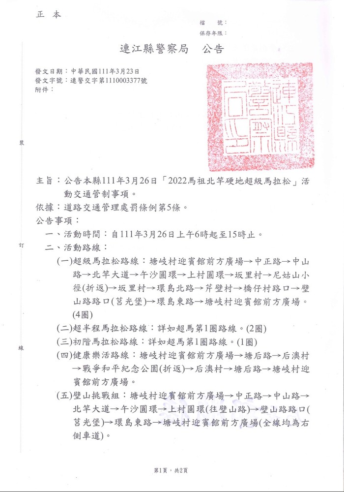 有關3月26日2022北竿硬地超級馬拉松活動,請民眾配合管制事項及交通人員指揮行駛。