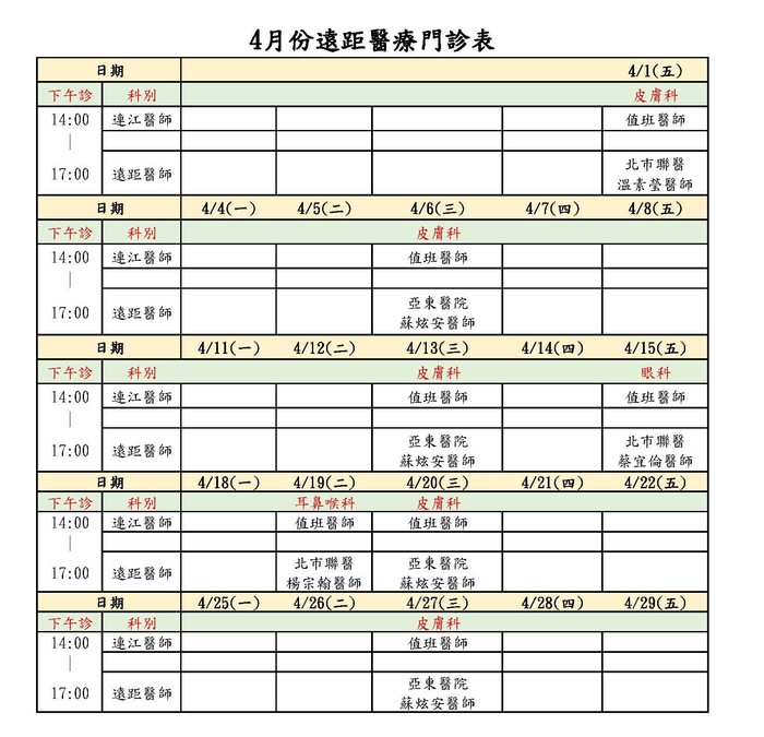 非固定門診:北市聯醫皮膚科、眼科、耳鼻喉科