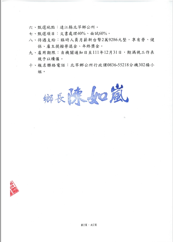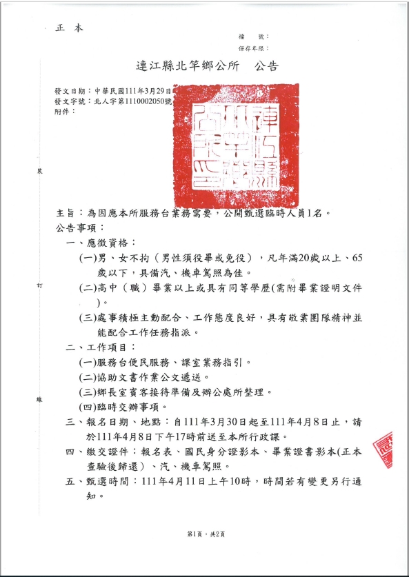 北竿鄉公所甄選行政課臨時人員1名
