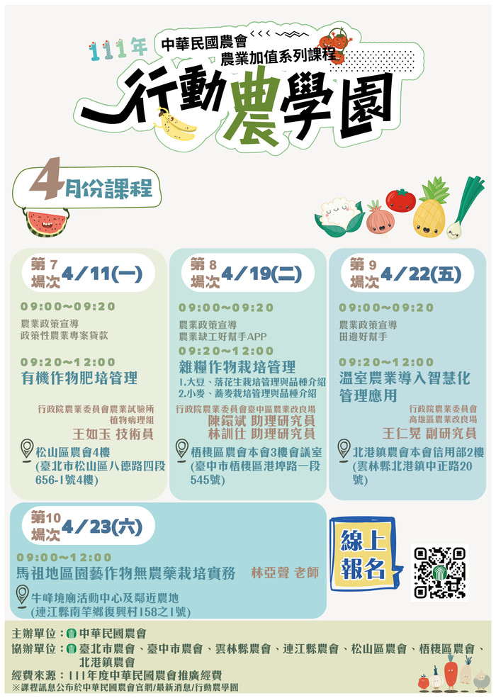 馬祖地區園藝作物無農藥栽培實務 --閱讀人次 : 682 主旨:檢送中華民國農會會4月份「行動農學園」課程表,請所屬相關人員踴躍報名參加。
