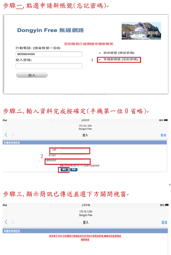 由於目前WiFi的認證系統只能設定帳號的有效期為999天(約兩年九個月),在此通知各位用戶,如近來出現無法正常連上DongyinFree或頁面出現 “您的帳號已過期請申請新帳號”,請您依下列步驟重新申請帳號,完成申請新帳號後會以簡訊方式提供新的四位上網密碼,若造成您的不便請見諒,謝謝!