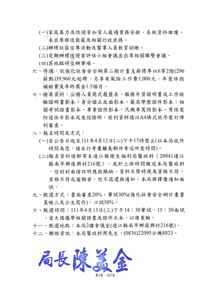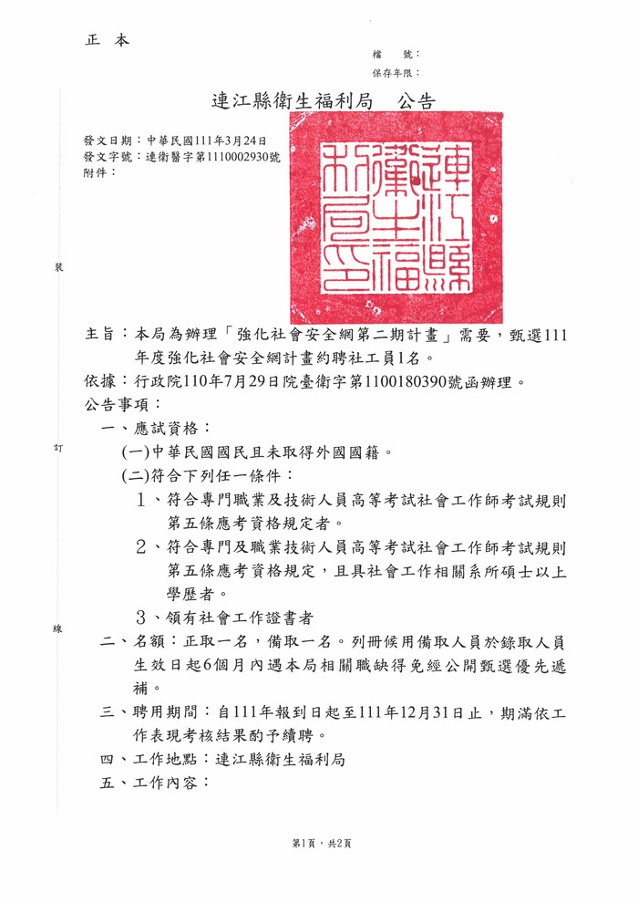 衛福局甄選強化社會安全網約聘社工員1名
