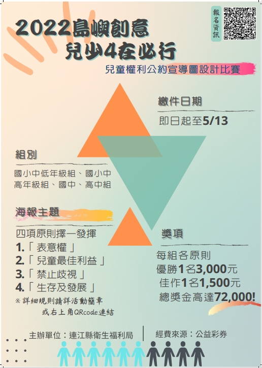 這次海報競賽將分為高中、國中、國小中高年級及國小中低年級組,並可依個人喜好挑選原則(禁止歧視、兒童最佳利益、生存及發展權、表意權)作為發揮,每原則將會獨立評選,各組搭配每原則將取優選和佳作各1名頒發優厚獎金及獎狀乙紙!!