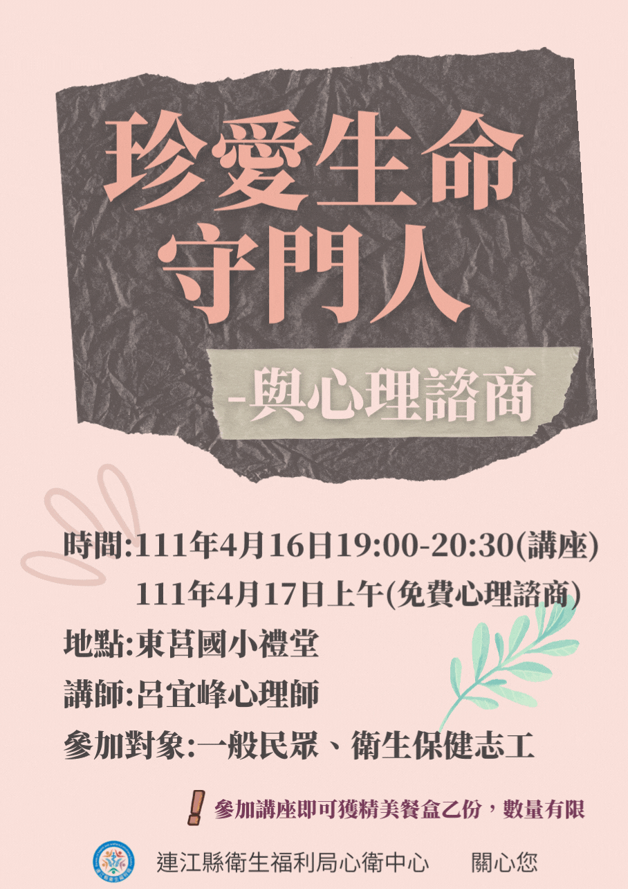時間:111年4月16日19:00-20:30(講座)111年4月17日上午(免費心理諮商預約:1小時/每人)