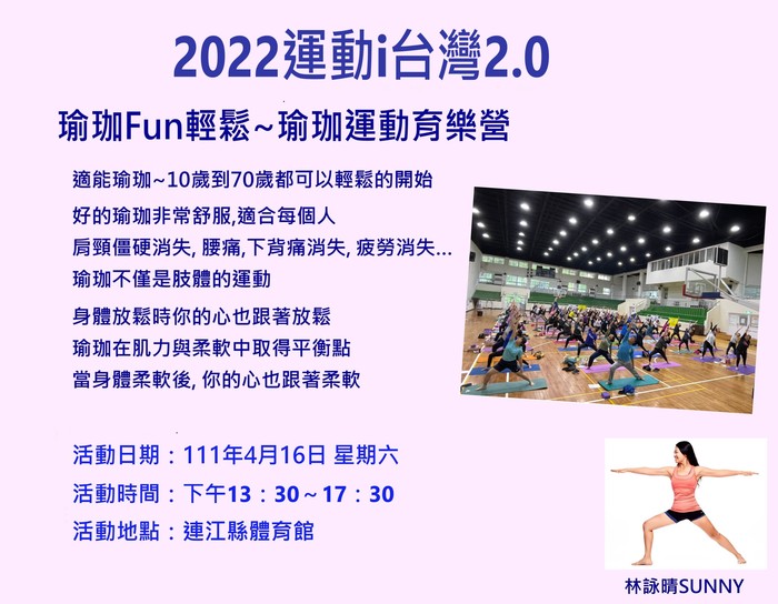 報名參加4月16日於南竿體育館舉辦之「運動i台灣2.0-瑜珈有氧體適能體驗營」活動者,請各位學員於13:20前完成報到,我們於下午13:30準時上課