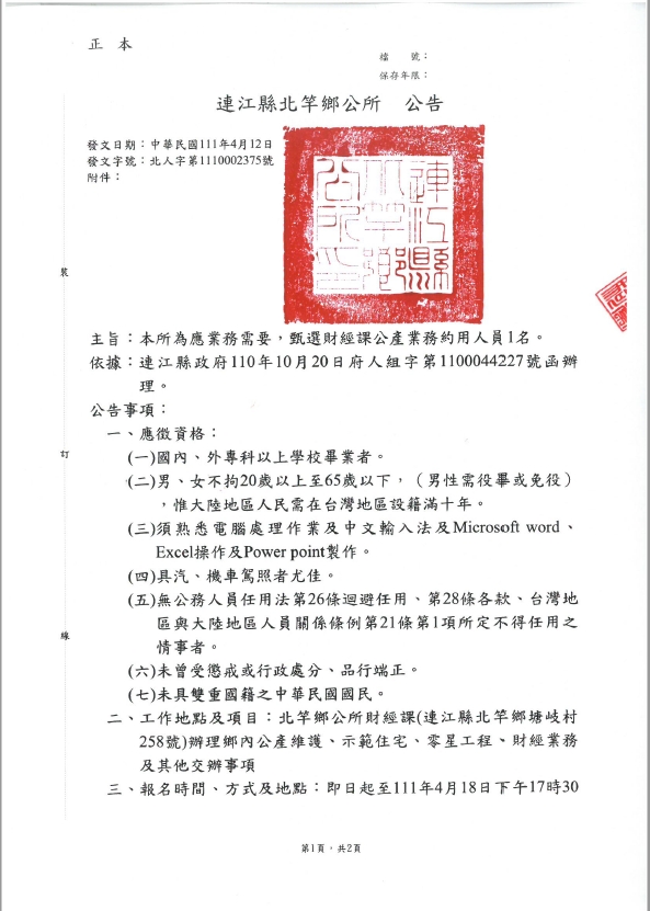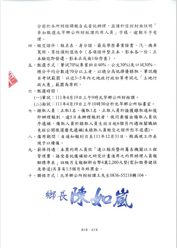 北竿鄉公所甄選財經課約用人員1名