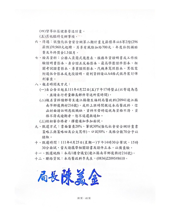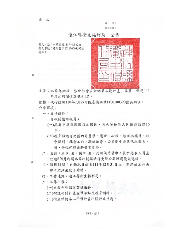 衛福局甄選111年「強化社安網第二期計畫」約聘關懷訪視員1名