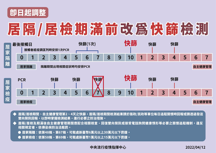 即日起調整居隔/居檢期滿前檢測方式