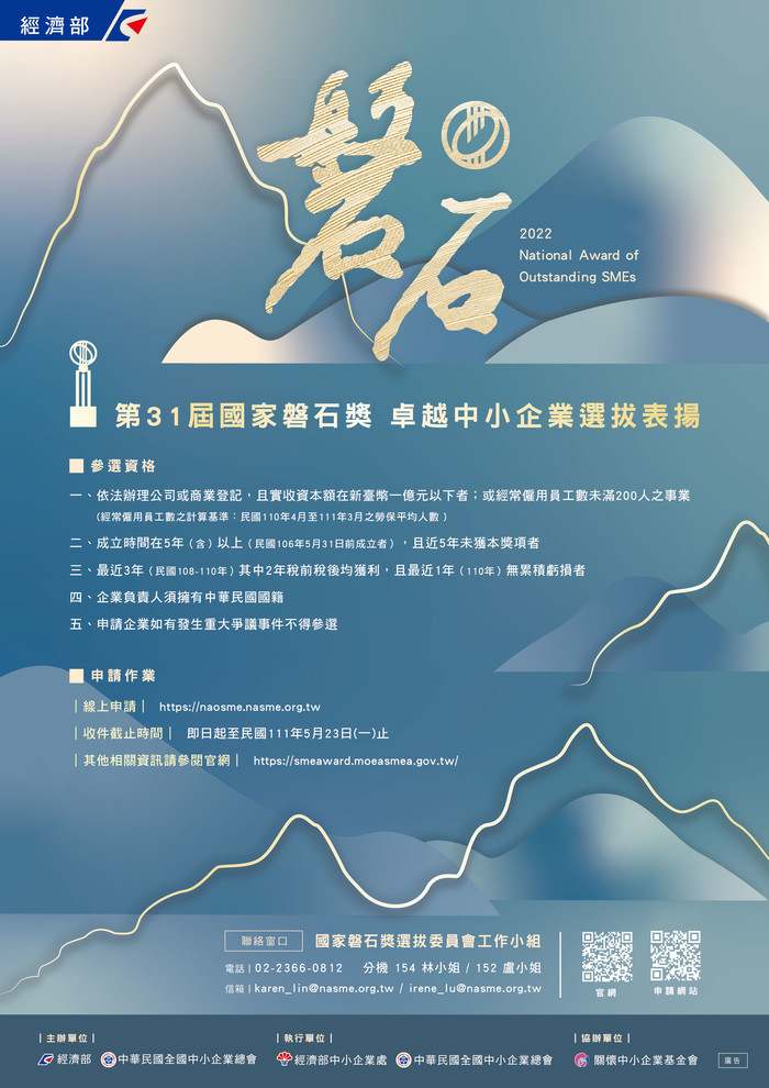 第31屆國家磐石獎-卓越中小企業選拔表揚活動計畫,即日起至5/23受理申請