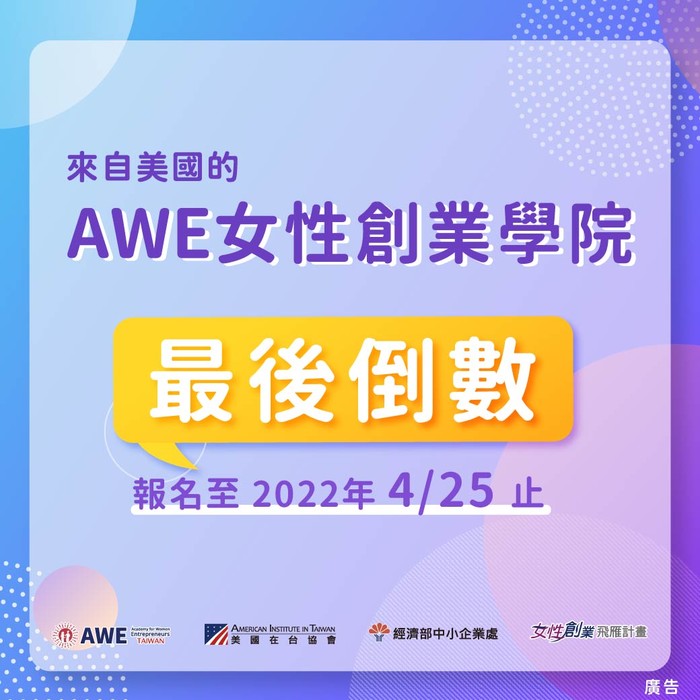 AWE女性創業學院招募女創家 --閱讀人次 : 625 報名倒數!【橫跨全球80國的AWE女性創業學院-招募90位女創家!】