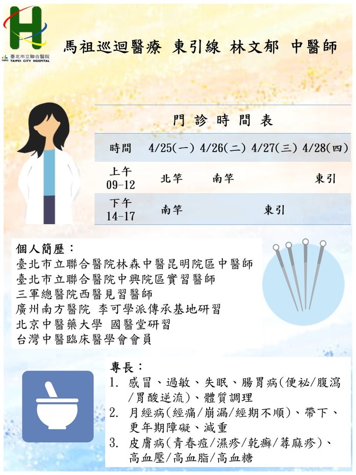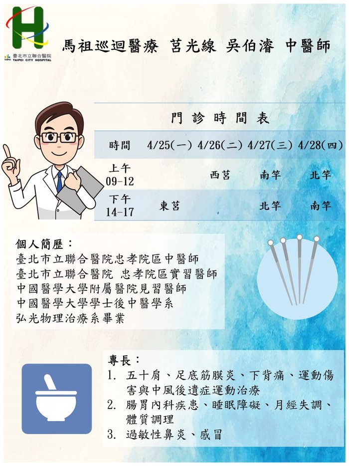 馬祖中醫巡迴醫療服務111/04/25-04/28,將由東引線 林文郁醫師、莒光線 吳伯濬醫師前往支援,請大家多多利用,看診時記得全程戴口罩喔!