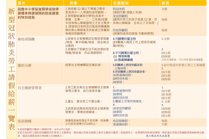 新型冠狀病毒請假一覽表 --閱讀人次 : 1833 有關「防疫照顧假」之請假規定