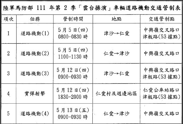 因應軍方111年第2季「雲台操演」任務需要,本(111)年5月5、12、13日實施管制部分時段,詳情如下:
