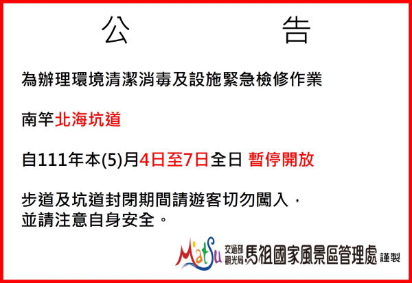 南竿北海坑道5/4至5/7暫停開放