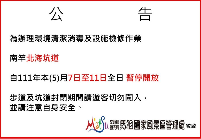 本(5)月8-11日止計4日,南竿遊客中心延續辦理環境清消及設施檢修作業,視聽室及販賣部暫停開放及營業,僅提供旅遊諮詢服務。造成不便 敬請見諒!