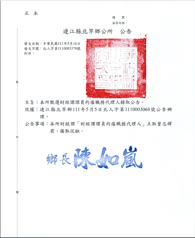 北竿鄉公所財經課課員約僱職代錄取公告