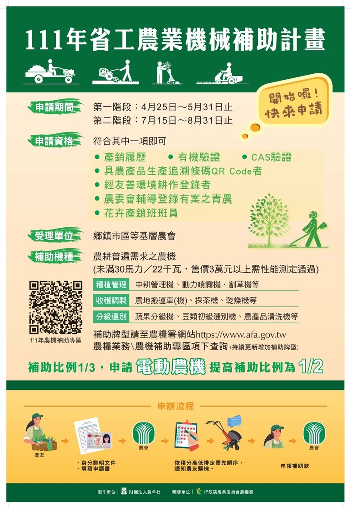 農糧署小型農機補助第一階段受理到5月31日止;第二階段申請自7月15日至8月31日止。另外,電