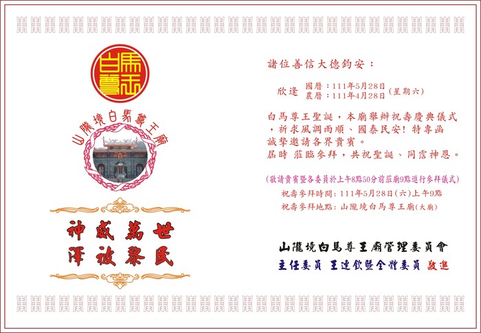 明111年5月28日(星期六)山隴境白馬尊王舉辦千秋聖誕祝典,