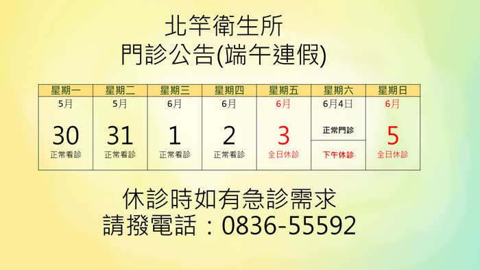 北竿衛生所於111年6月3日(星期五)當日休診1日。有慢性病藥物需求的民眾,可提前就診領藥