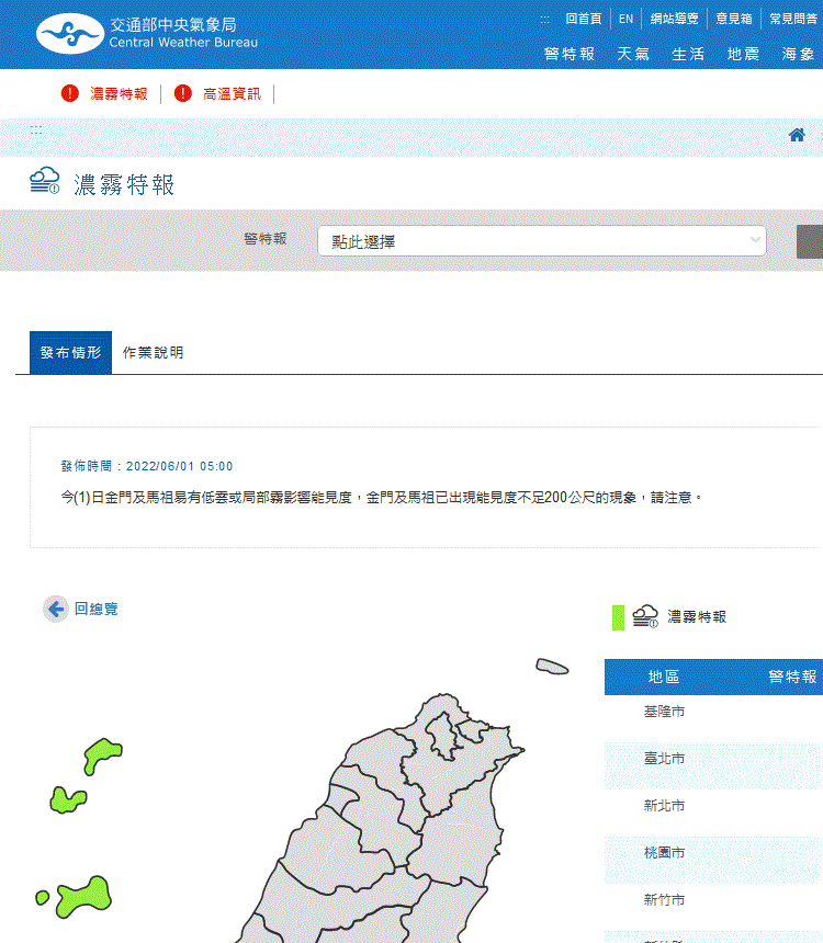 中央氣象局05:00發布馬祖地區濃霧特報