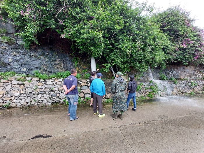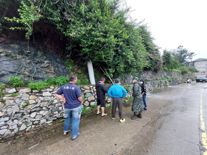 舊衛生所旁砌石墻因連日大雨滲水嚴重,本所業於6月10日會同災害緊急搶修廠商、北高守備大隊進行現地會勘,預計於雨勢漸歇後實施後續修復工程,但該路段仍然濕滑,請用路人行經此處請減速慢行小心駕駛,北竿鄉公所關心您。