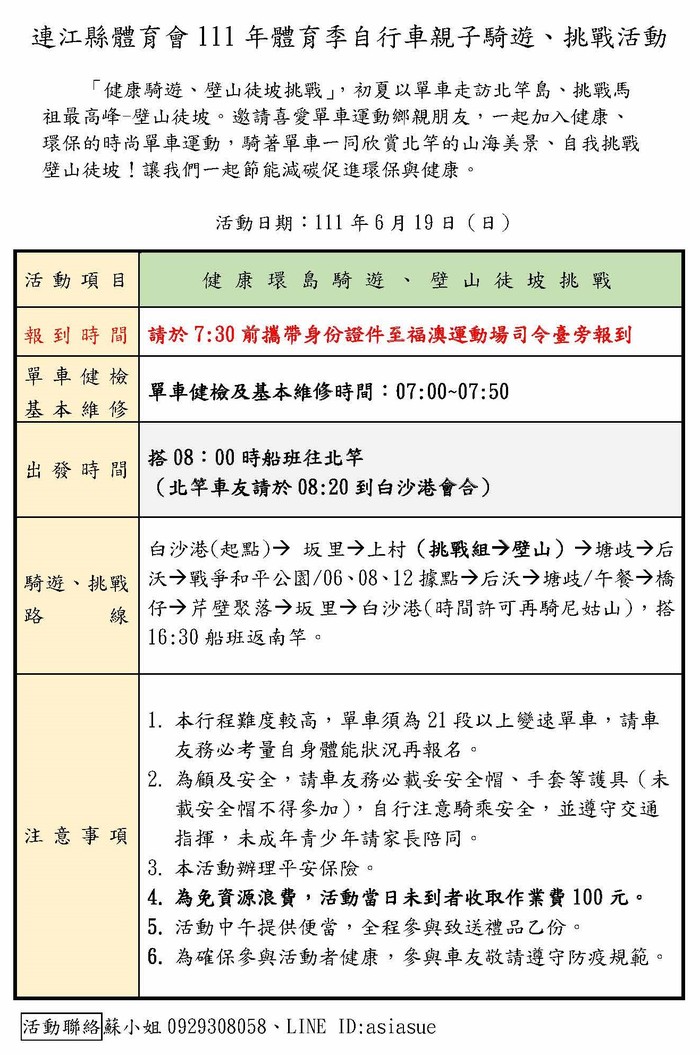 6/19(日)「健康騎遊、壁山徒坡挑戰」已報名人員請注意