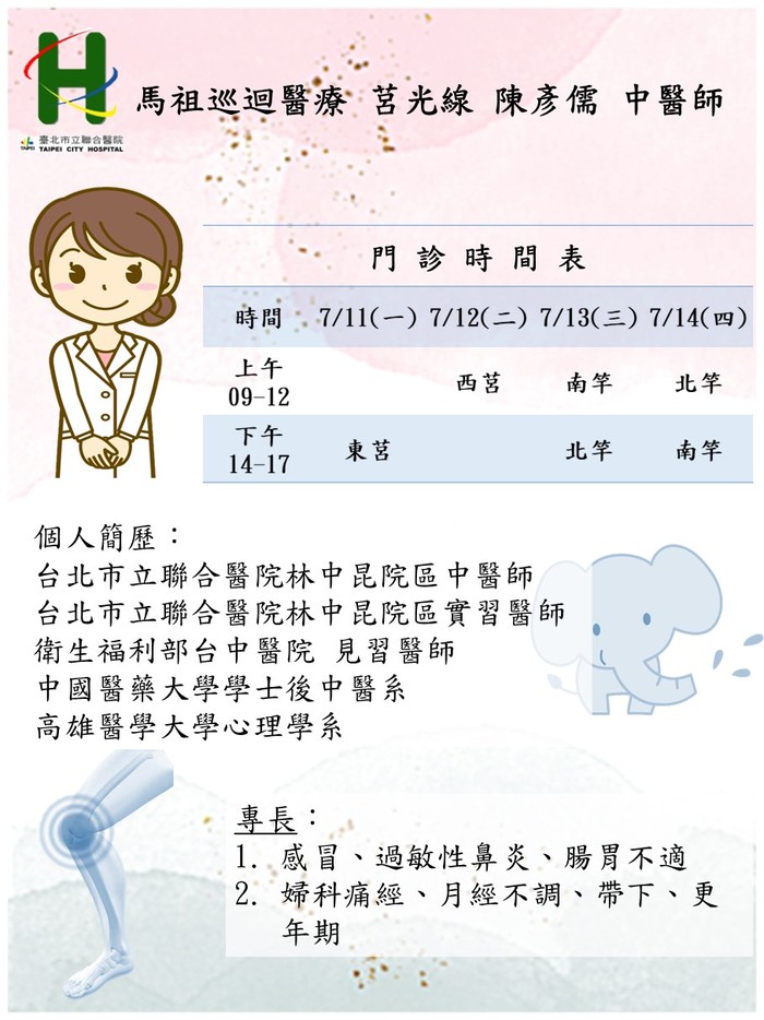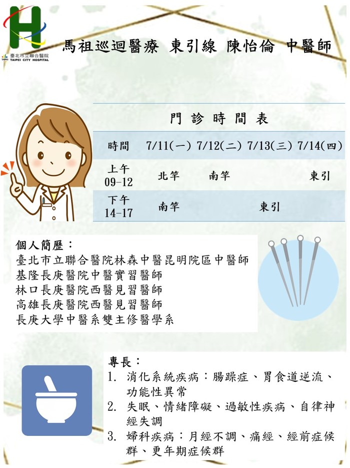 馬祖中醫巡迴醫療服務111/07/11-07/14,將由東引線 陳怡倫醫師、莒光線 陳彥儒醫師前往支援,請大家多多利用,看診時記得全程戴口罩喔!