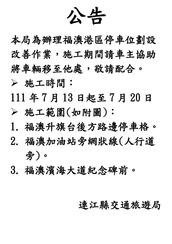 福澳港區停車格劃設改善作業 移車公告