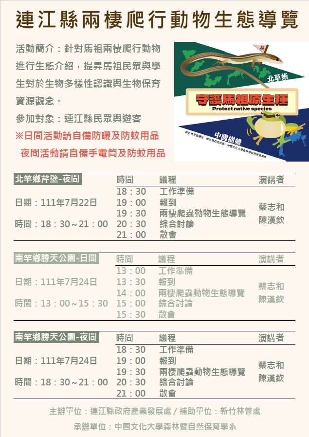 來觀察兩棲爬行動物!-北竿場還有名額! --閱讀人次 : 652 各位知道馬祖有哪些兩棲爬行動物嗎?是否曾在哪個小角落發現牠們呢?這次讓我們一起近距離觀察牠們吧!