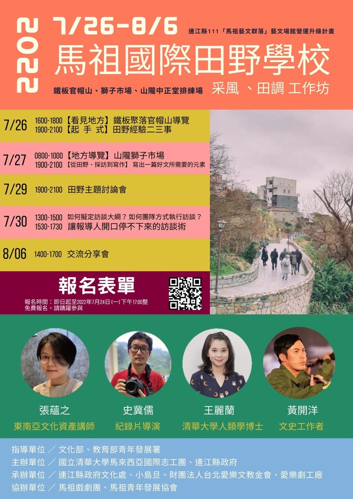 2022馬祖國際田野學校報名 --閱讀人次 : 1004 馬祖以『文化立縣』為施政核心目標,而藝文發展的本質在於內容,而這些內容的取得,來自於歷史脈絡與社區居民的日常生活中,以馬祖的民生、歷史、民俗慶典等項目為出發點。