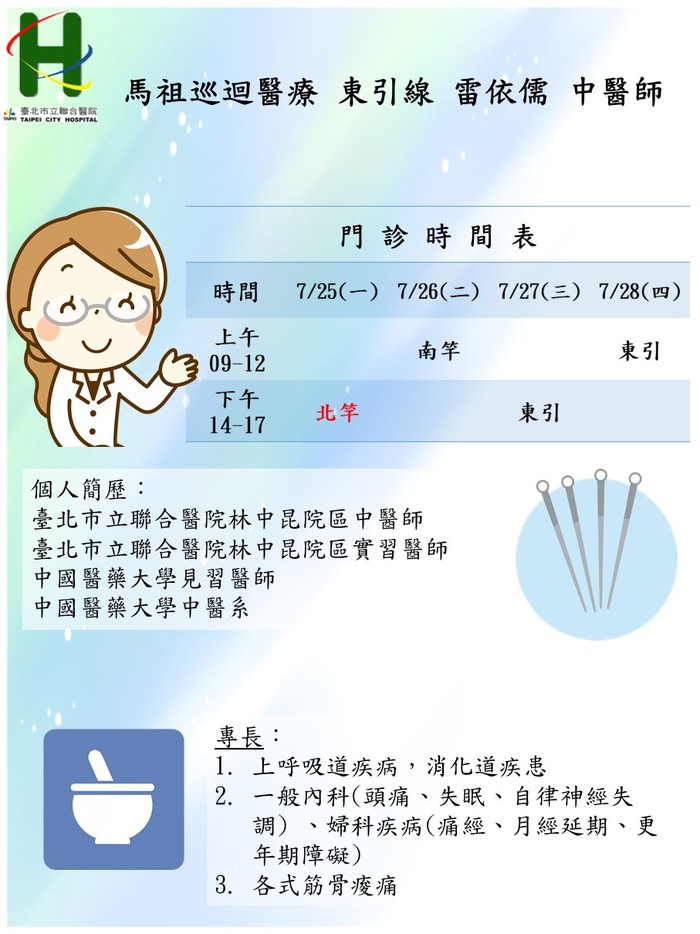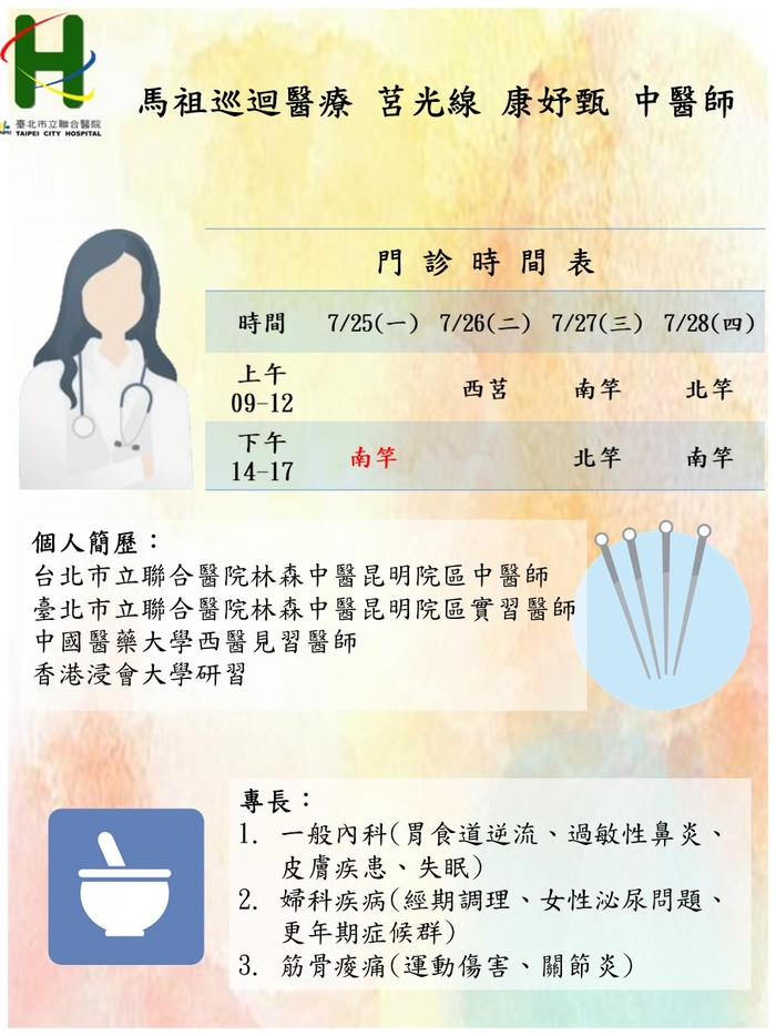 馬祖中醫巡迴醫療服務111/07/25-07/28,將由東引線 雷依儒醫師、莒光線 康妤甄醫師前往支援,請大家多多利用,看診時記得全程戴口罩喔!