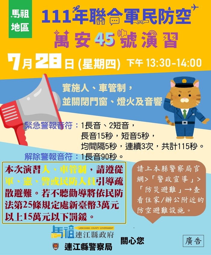 連江縣111年全民防衛動員「萬安45號」軍民聯合防空演習,馬祖地區將於7月26日(星期二)13時30分至14時進行第1次預演、7月27日(星期三)13時30分至14時第2次預演,預演時僅試放警報5秒,不實施人員疏散避難及交通管制,7月28日(星期四)13時30分至14時正式實施防空演習,本次全民防空演習重點項目為(一)防情傳遞。(二)警報發放。(三)人、車疏散避難。(四)防空避難處所之開放。(五)居民熄滅燈火及關閉門窗等管制作為。