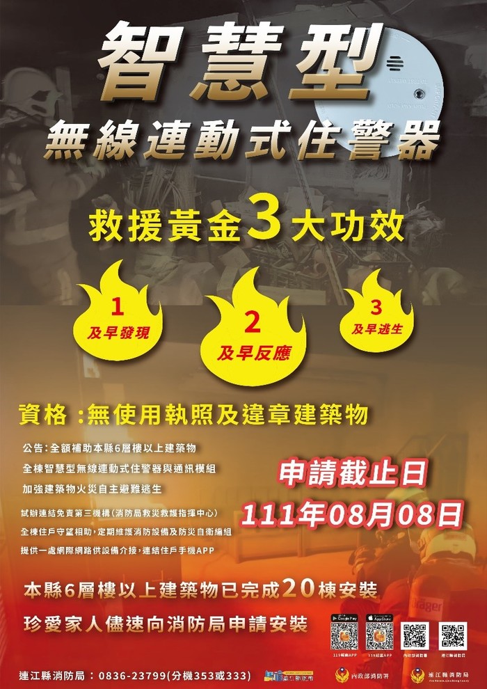 連江縣消防局連動式住警器申請提醒 --閱讀人次 : 1082 本縣6層樓以上建築物智慧型無線連動式住宅用火災警報器申請截止日111年8月8日,請各位鄉親把握機會: