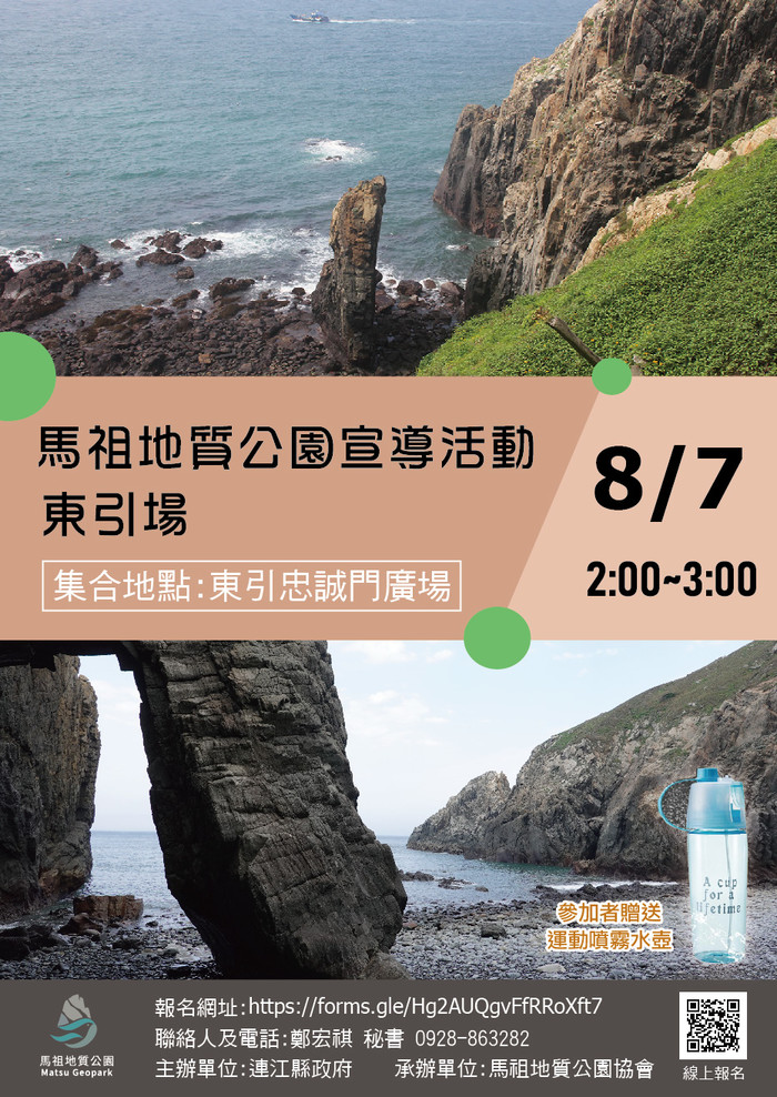 8/7馬祖質公園宣導活動東引場 --閱讀人次 : 656 馬祖地質公園是全台灣第一個依法公告的地方級地質公園,在馬祖四鄉五島共規劃10個景觀區,東引鄉有西引海岸景觀區及東引世尾山景觀區2處。本次宣導活動將帶領大家到西引的后澳,這裡是東引的秘境景點之一,沿著階梯走到海岸上,可看到海蝕洞、海蝕柱、海蝕凹壁等豐富的海蝕地景,走到海邊讓大家近距離接觸東引天然的海岸,享受大自然地景之美。歡迎大家報名參加,參加者將致贈馬祖地質公園限量運動噴霧水壺,名額有限,額滿為止。