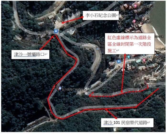 3.封閉路段及日期:第一階段勝天路(津沙路口)至101民宿路段111年8月1日08:00至111年8月31日18:00止