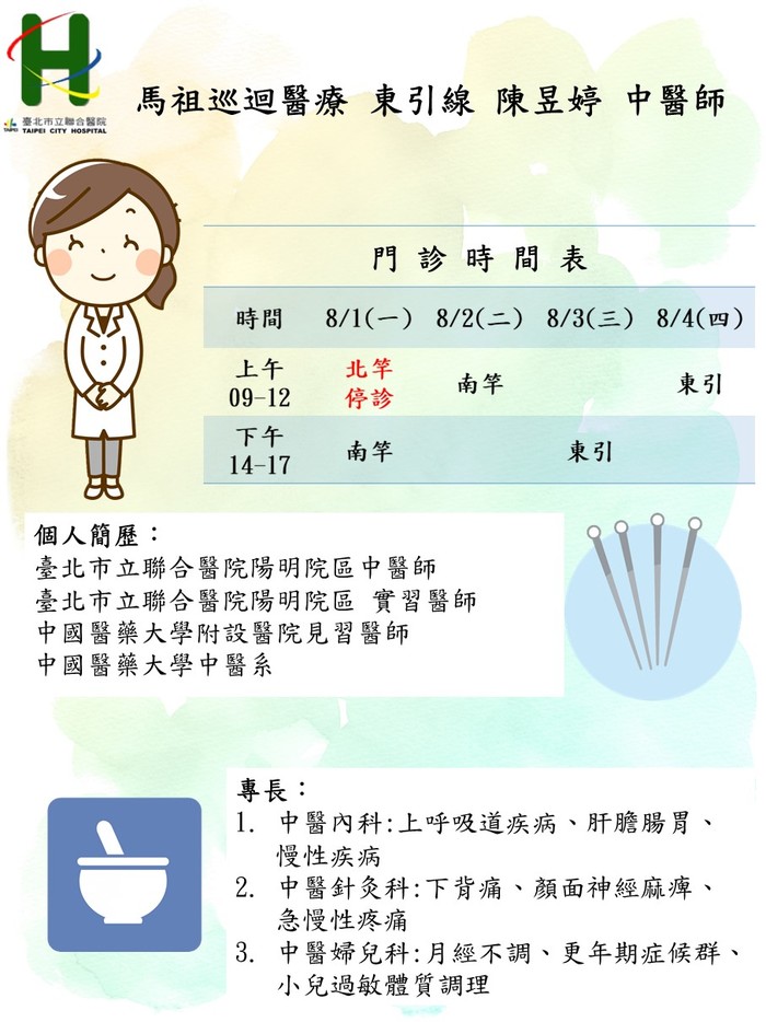 陳昱婷醫師 上午 北竿衛生所 暫停;下午 南竿縣立醫院 ➔ 照常服務