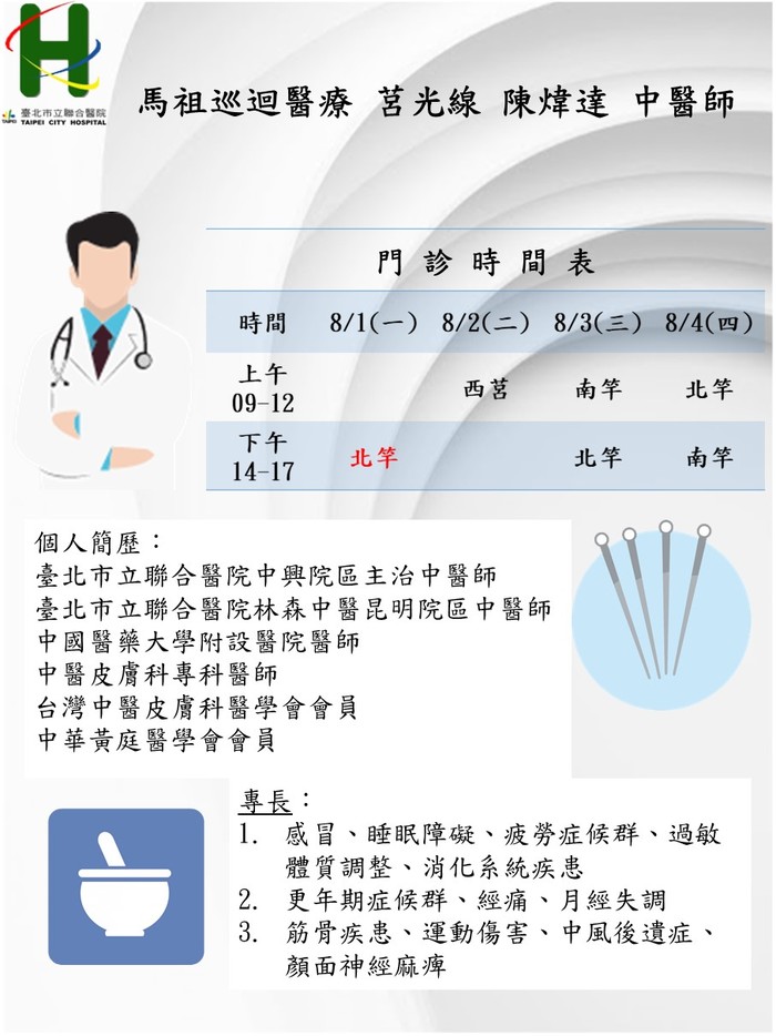 1. 馬祖中醫巡迴醫療111/08/01-04由莒光線 陳煒達醫師、東引線 陳昱婷醫師前往支援服務,若有中醫相關健康需求,請大家多多利用。
