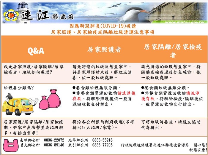 環資局強調,如民眾居家照護期間有迫切倒垃圾的需求,請將垃圾盛裝並包裹嚴實後,電洽各鄉公所電話,鄉公所將派員到府收運。也已將常見的防疫垃圾收運疑問整理成「問答全攻略」懶人包,解答鄉親居家隔離及居家照護期間,關於垃圾收運的相關疑惑,也歡迎大家分享防疫垃圾收運的正確資訊。
