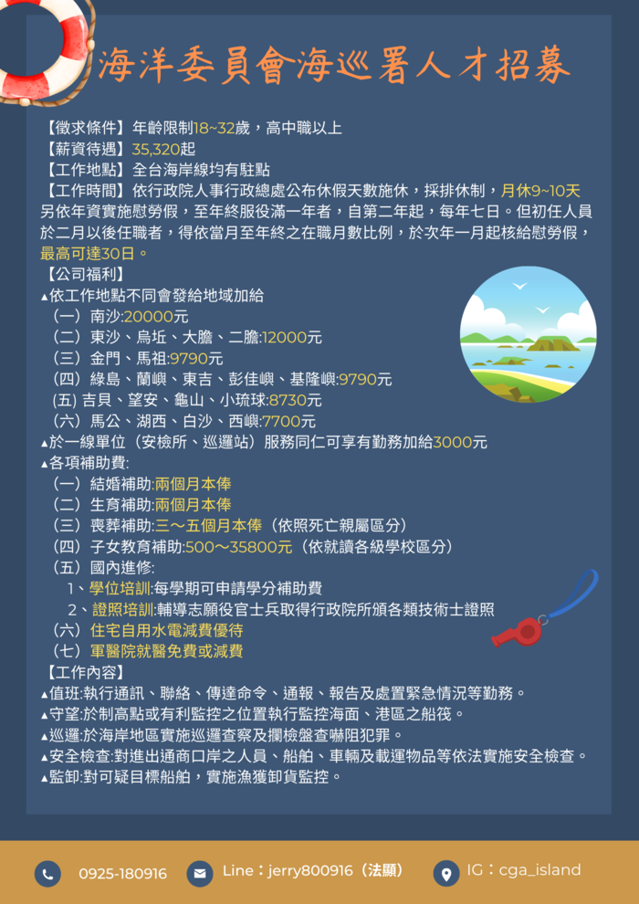 【薪資待遇】35,320元起(馬祖起薪45,110元)