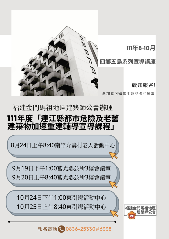 本縣危老建築加速重建宣導課程報名開始! --閱讀人次 : 1056 福建金門馬祖地區建築師公會針對本縣「都市危險及老舊建築物加速重建」業務